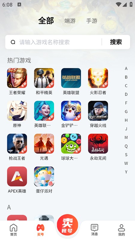 2、进入首页后,点击底部“买号”按钮,在搜索框中输入游戏名称或关键词进行查找,也可以直接从热门游戏列表中挑选心仪游戏。