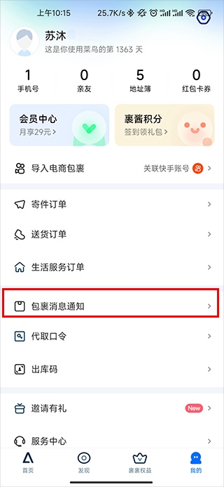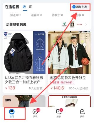 1、首先访问左下角的【首页】界面,点击其中的【+添加包裹】按钮
