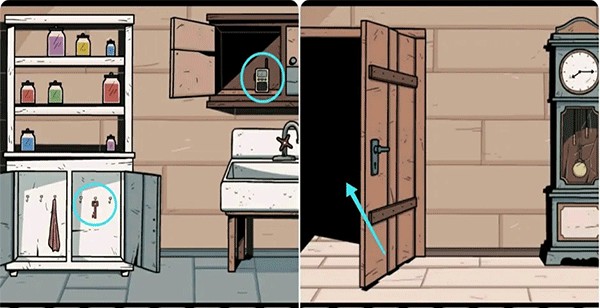 2、打开蓝色的门进入盥洗室,按照片上的提示摆放架子上的罐子,完成后拿走下面的钥匙,接着打开水池上方的柜子拿到对讲机,然后出去用钥匙打开钟表左侧的门。