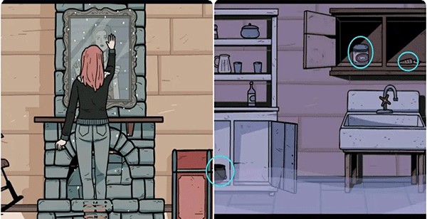 7、将宝石嵌入画框下方的凹槽内来到后面的世界,然后与梅里迪亚对话获取任务,接着到盥洗室搜索道具拿到坩埚、鱼罐头和胡萝卜。