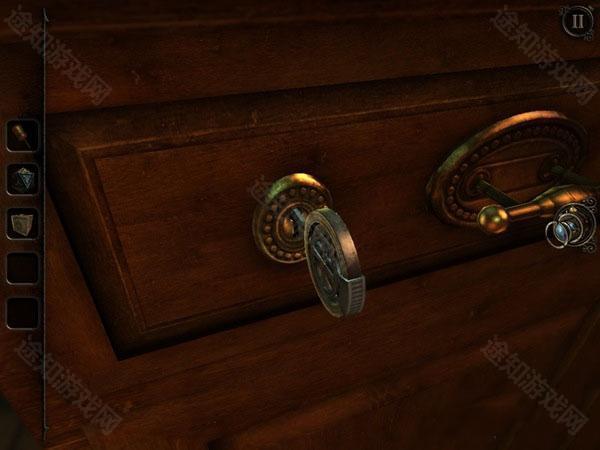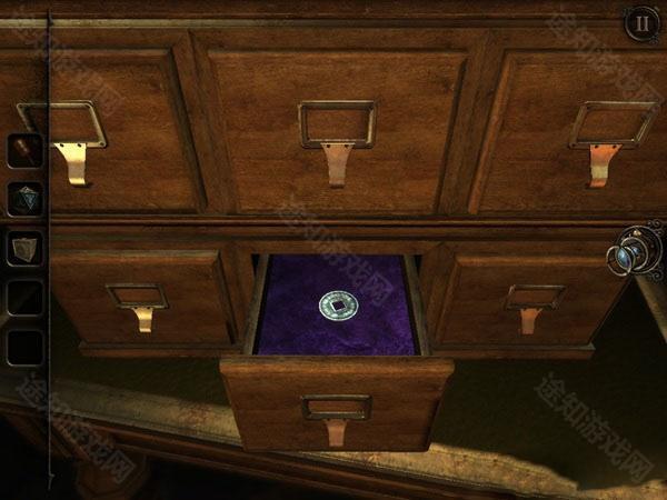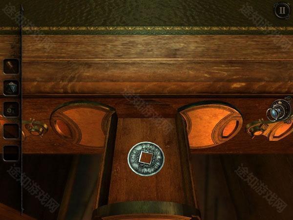 接下来,你需要全神贯注盯着木柜上闪动的白色花纹,因为这是一个考验你记忆力的小游戏,当闪动四次后,按照花纹出现的顺序开启小柜,你就会从中间下边的柜桶获得第二枚硬币。