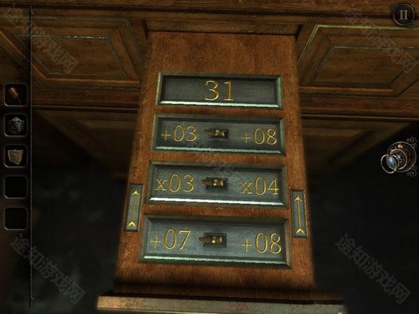 进入地窖后,你将迎来一条十分难懂的数学题。走向右侧的电闸处,拉开上面三个拉闸,你会看到三条算术题。由下至上,通过相加、相乘、相减后,最终的结果要等于它指定的数字。调整后把拉闸拉回去,右侧的电柜就会通电,接着将上面的滑条拉至亮光那一行,电柜就会指引你回到图书馆。当你走出地窖时,你就会听到电话响的声音。