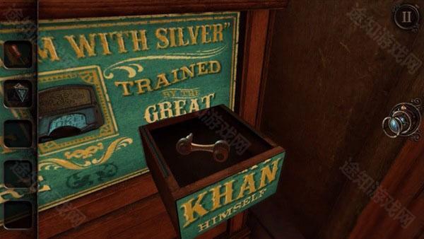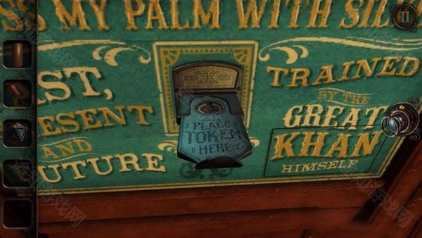 接下来的目标就更明确了,当再次进入房间后,马上来到塔罗牌游戏机前,到处都戳戳,看有啥地方可以动的。然后,你会发现塔罗牌游戏机中间有个 PLACE TOKEM HERE 的入口,把它拉出来,就可以得到第一个小机械装置。