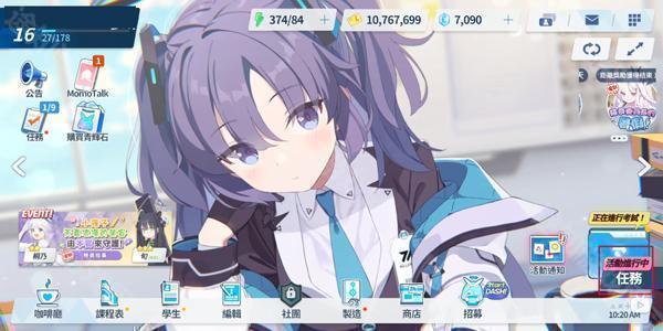 4、进入游戏界面,下方包括【咖啡厅】、【课程表】、【学生】、【编辑】、【社圈】、【制造】、【商店】、【任务】和【招募】等频道,我们选择【任务】选项,