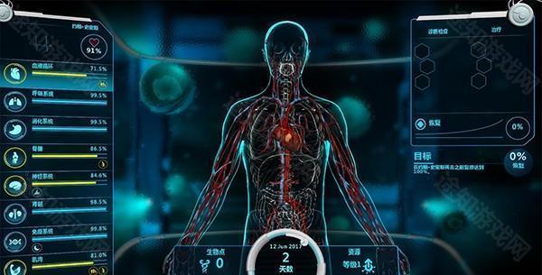 进入透视图,立马可以看到病人的健康状况以及各类初始buff,例如骨骼右下方的黄色负面buff 与神经系统左下方的蓝色正面buff。根据很多负面buff其实可以大大的帮助玩家判断病情方便诊断。而这个病人可以看到,已经成年并且步向老龄,机智的笔者立马意识到,病人的骨骼和肌肉虽然健康值也在下降,但很有可能是病人年龄过大造成的,非疾病影响,因此接下来诊断应该侧重于神经与血液系统。