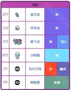 紫:暴飞龙家族,冰砌鹅,苍炎刃鬼,密勒顿。还有没有公布的未来种。顿甲(未来种)、火神蛾(未来种)、艾路雷朵(未来种)、铁掌力士(未来种)、信使鸟(未来种)、三首恶龙(未来种)、班吉拉斯(未来种)和毕力吉翁。