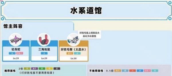 玻瓶镇的水馆主海岱,三只宝可梦,最高级是30级的好胜毛蟹,不要用草猫打它!这玩意可不是水系哦!虽然他后面还是会太晶水。。此时换上一只电系比如咩利羊打他就行了。